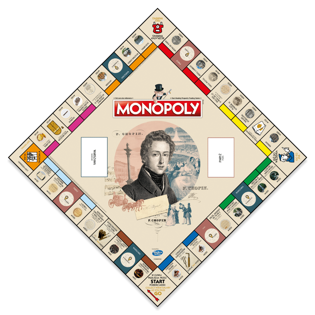 MONOPOLY The Fryderyk Chopin Institute is a unique, bilingual edition of the game, created on the occasion of the Fryderyk Chopin International Piano Competition. The edition had its premiere and display during the event, to be later included in the Institute’s regular sales. The board featured places and objects connected with both Fryderyk Chopin himself and his works. The game was designed to explore the great composer’s traces.