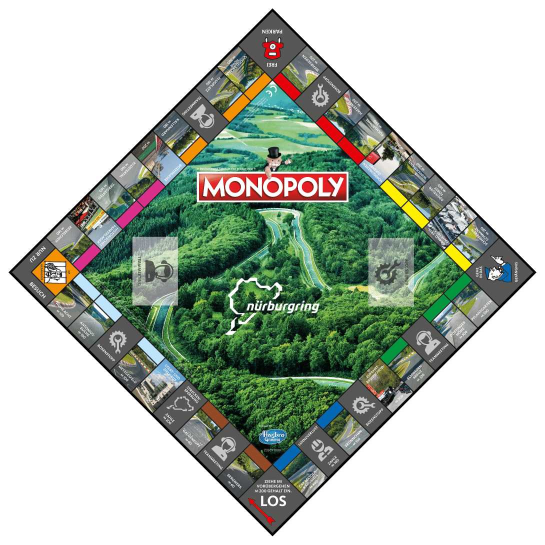 An exciting race on a track… MONOPOLY? The Nürburgring is a famous German racetrack that has lived to see its own game edition! In addition to the standard fields, the MONOPOLY board features the most important sections of the track. The special fields have been marked with themed icons and the Chance and Community chest cards have been divided into categories: team meetings and pit stops.